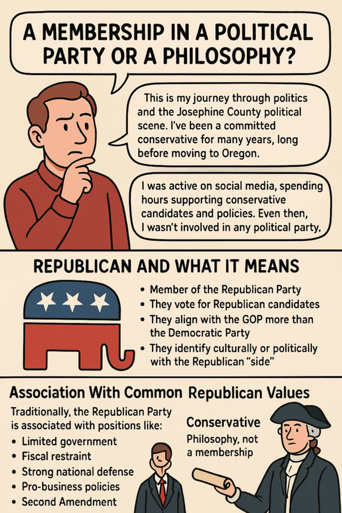 This is my journey through politics and the Josephine County political scene. I’ve been a committed conservative for many years long before moving to Oregon. I was active on social media, spending hours supporting conservative candidates and policies. Even then, I wasn’t involved in any political party.
